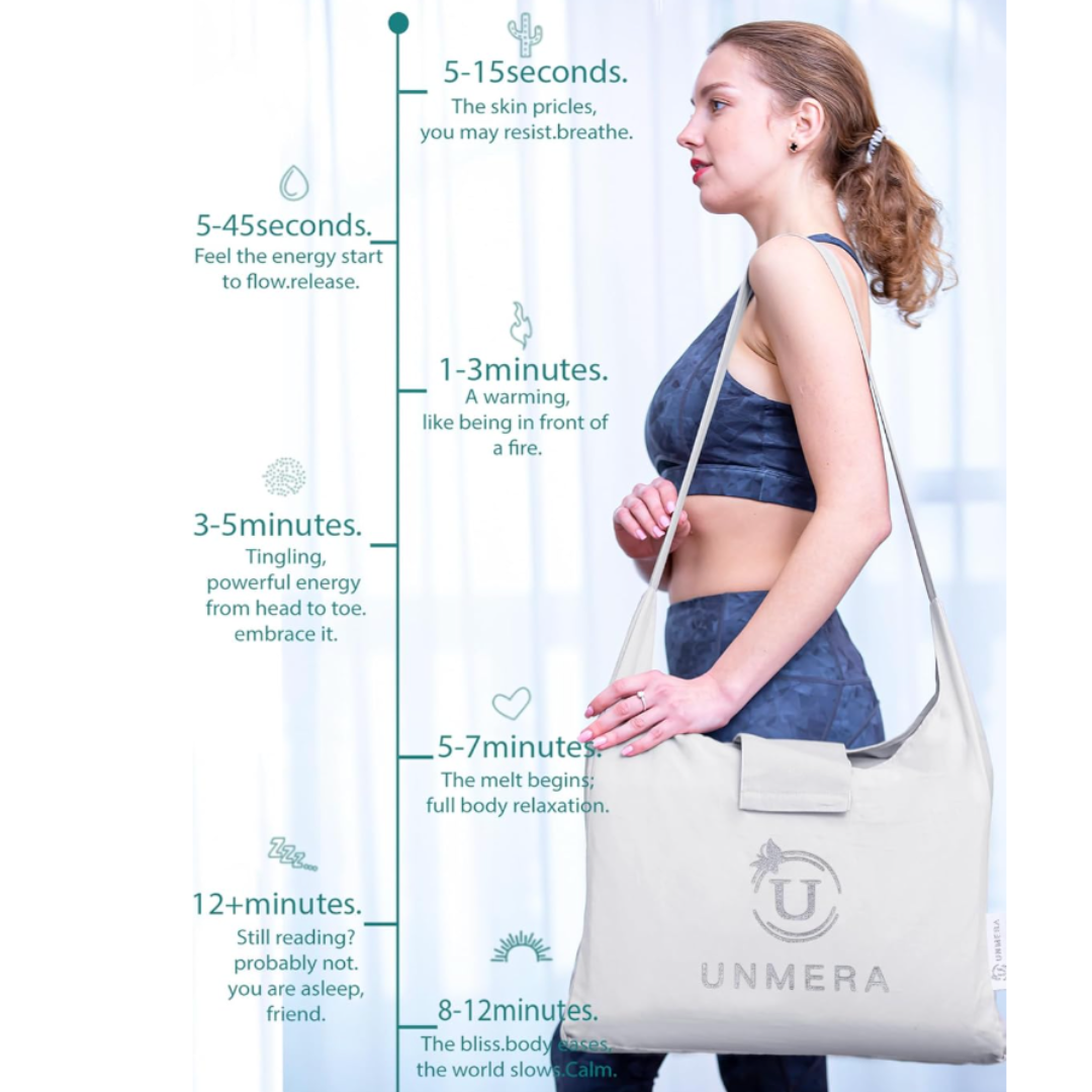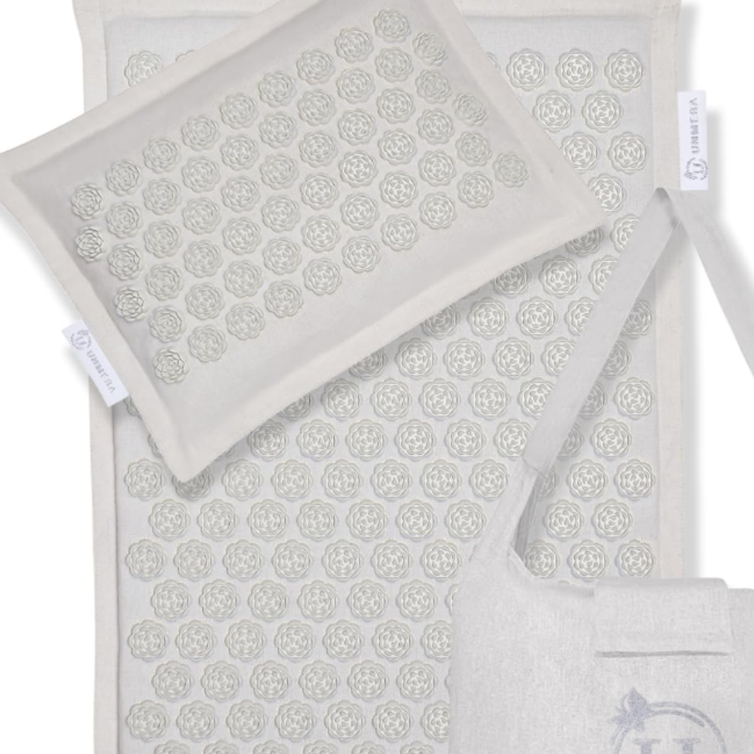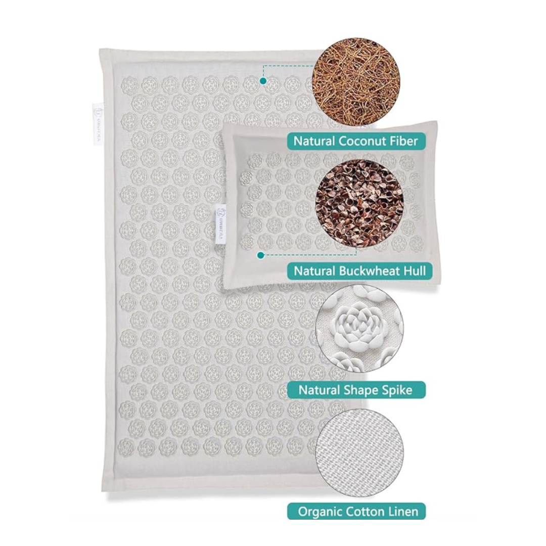 What is this? Incredible health benefits from a mat? Increased circulation? Stimulate blood to surface of body? The Unmera Acupressure Mat and pillow Set in chic natural Eco-Linen & Coconut Fiber is in stock now beloved for back and neck relief from sciatic.