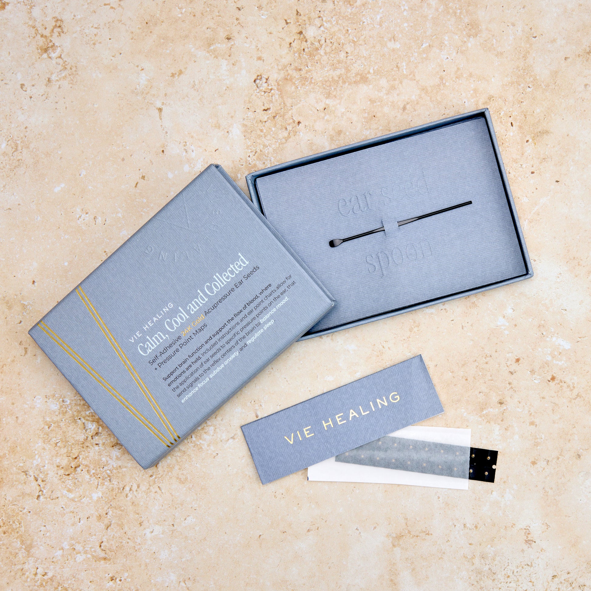 A beautiful Chinese medicinal art Ear Seeding involves placing small 24K gold seeds on specific points on the ear to stimulate acupressure. The gold seed is sold with adhesive tape for easy application with any tweezer or by hand. Included is a small spoon for easy removal. The packaging instructs preferred placement. Enjoy the subtle shimmer of these tiny accessories along with the experience of increased balance of the body and mind. Recommended for boost mood, regulate focus, subdue anxiety and enhance sleep the VIE HEALING Calm, Cool and Collected set is a natural and gentle alternative healing modality that allows you to meet pain with ancient Chinese remedies that have stood the test of time and are as modern as they timeless.