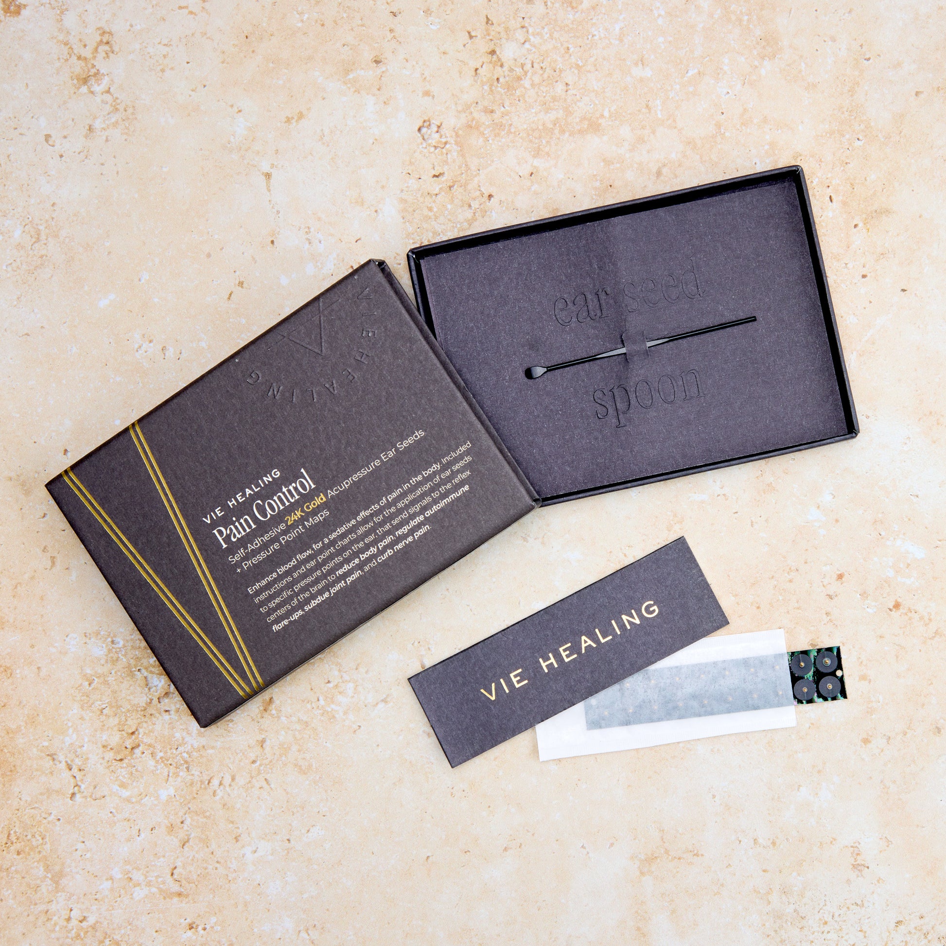 A beautiful Chinese medicinal art Ear Seeding involves placing small 24K gold seeds on specific points on the ear to stimulate acupressure. The gold seed is sold with adhesive tape for easy application with any tweezer or by hand. Included is a small spoon for easy removal. The packaging instructs preferred placement. Recommended for body pain, autoimmune, joins and nerves the VIE HEALING Pain Control set is a natural and gentle alternative healing modality that allows you to meet pain with ancient Chinese remedies that have stood the test of time and are as modern as they timeless.